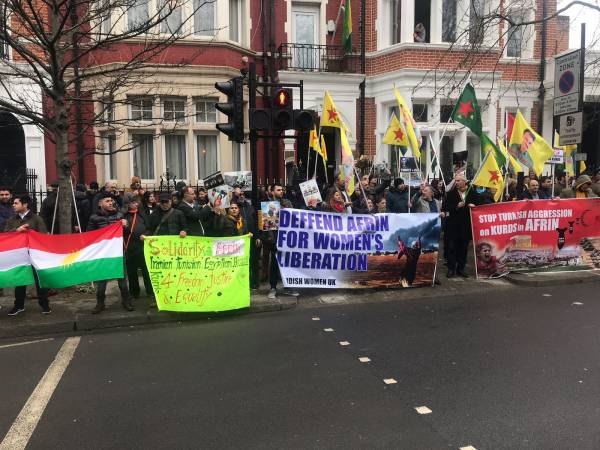 كما ونظّم الكردستانيون وأصدقائهم من مناصري قضية الشعب الكردي وقفة احتجاجية أمام السفارة الروسية في العاصمة البريطانية لندن للتنديد بمحاولات الجيش التركي ومرتزقته لاحتلال عفرين. نُظّمت الوقفة من قبل مجلس الشعب الكردي وبريادة من "منصة التضامن مع عفرين"، حين ندد المشاركون بمساندة الدولة الروسية للعدوان التركي على عفرين وأشاروا إلى حصة روسيا في المجازر التي يرتكبها جيش الاحتلال التركي ومرتزقته بحق مدنيي عفرين لتنتهي الوقفة بترديد شعارات من قبيل "الجيش التركي يقتل وروسيا تدعم" و"عاشت مقاومة عفرين" و"البارحة كوباني واليوم عفرين" و"فليخرج الجيش التركي من عفرين".