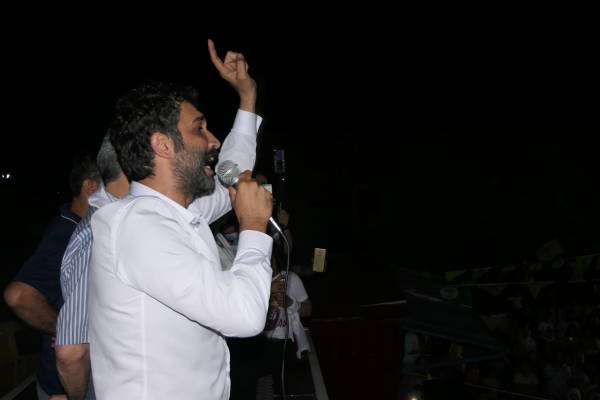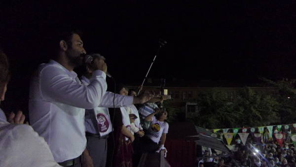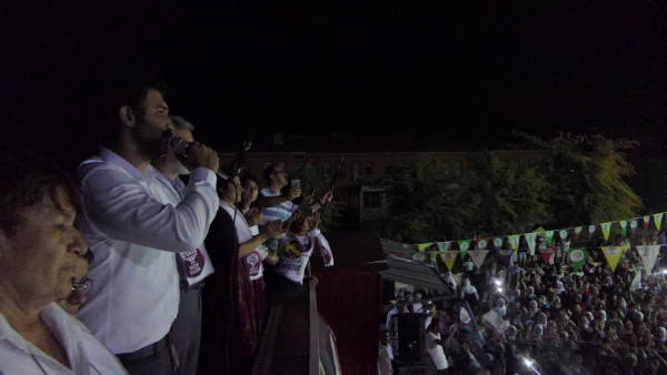 وبعد الوقوف دقيقة صمت اجلالاً لذكرى الشهداء، القى المرشح باريش أتاي كلمة أوضح انهم يسعون لحل جميع المشاكل عبر السلام لا بالحرب وقال: "نحن ندعو إلى السلام لا من منطلق الضعف لكن الطرف الآخر يرفض السلام والحوار، اذا ما أرادوا نضالاً ومقاومة فنحن اكثر من يجيد النضال والمقاومة. طالما يرفضون السلام ويعلنون الحرب فنحن أيضاً سنخوض تلك الحرب ضدّ الفاشية ومن اجل الحرية".