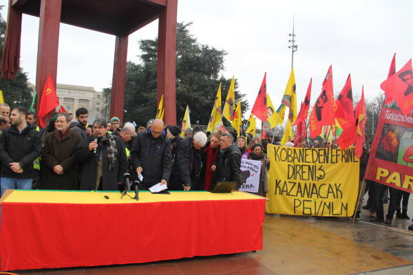 خلال التجمع ارتفعت حدة الغضب الشعبي ضد الصمت الذي تلتزمه الأمم المتحدة إزاء عدوان جيش الاحتلال التركي على عفرين وأوضح المشاركون أن السلطة التي أسرت أوجلان قبل 19 عاماً تقوم اليوم بمحاولة إمحاء النظام الذي تم تشييده بفلسفة أوجلان، كما أكد المشاركون بأن شعوب العالم لن تسمح بذلك ولن تتقبل أسر أوجلان أبداً.
