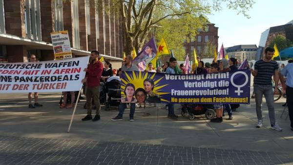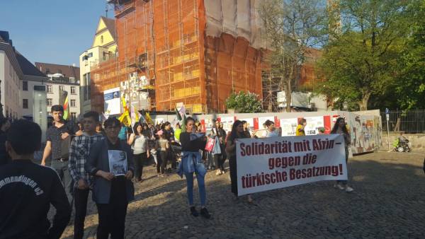 تجمع المئات من الكردستانيون في ساحة ألتي سيناغوغي، والتظاهرة انطلقت من الساحة حمل خلالها المتظاهرون أعلام وحدات حماية الشعب والمرأة، وصور قائد الشعب الكردي عبد الله أوجلان، وجابت التظاهرة شوارع مركز المدينة، وباسم جماهير الشعب قرء بياناً كتابياً في وسط سوق المدينة وخلاله تم استنكار الصمت الدولي و قوات السياسية التي تدعم احتلال عفرين، وناشد البيان على كافة القوات الدولية الوقوف ضد العزلة المفروضة على قائد الشعب الكردي عبد الله أوجلان، وعلى القيام بمهامهم.