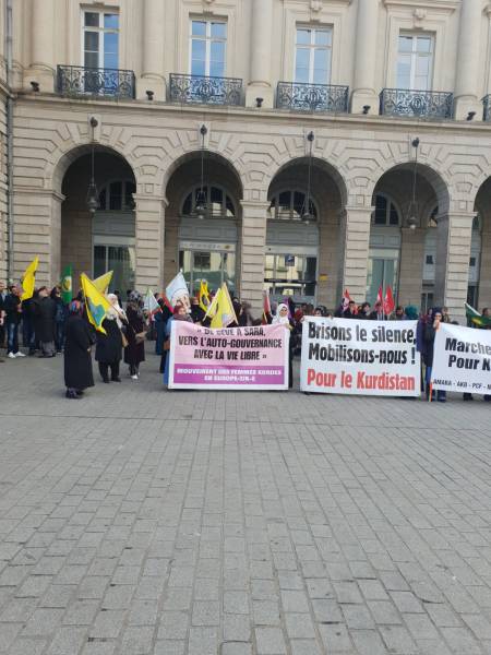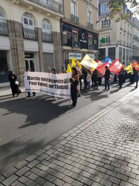 كما شهدت مدينة رين الفرنسية خروج الكردستانيين وأصدقائهم من مناصري قضية الشعب الكردي في مظاهرة منددة بهجمات جيش الاحتلال التركي، حيث سار الحشد حتى ساحة قصر الجمهورية وحييوا مقاومة كوباني ونددوا بهجمات الاحتلال التركي وأكدوا على مواصلة تنظيم الفعاليات ومساندة ثورة روجآفا.
