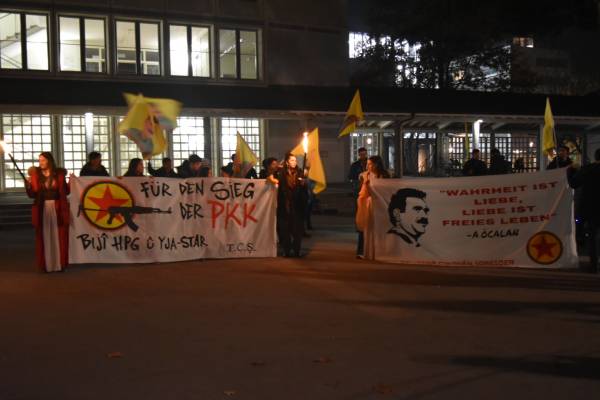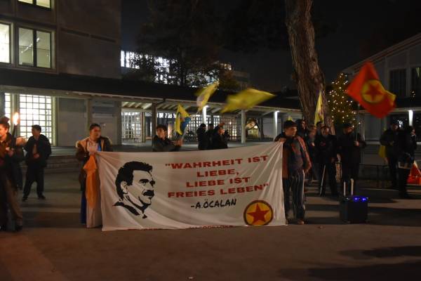 كما رفعوا لافتات التي كتب عليها "الحرية لأوجلان والحرية لكردستان"، ورفعت أيضا صور القائد أوجلان وأعلام حزب العمال الكردستاني .