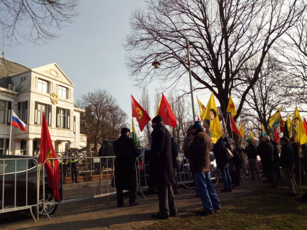 خرج كردستانيو أوربا في مظاهرة منددة بمساندة روسيا لعدوان الاحتلال التركي على عفرين، حيث وضع المتظاهرون شريطاً أسوداً على باب السفارة الروسية في لاهاي.