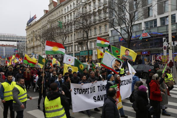 الآلاف يشاركون في مسيرة احتجاجية ضد العدوان التركي على عفرين في العاصمة النمساوية فيننا.