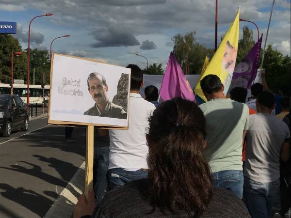 وحمل المحتجون صوراً للشهيد قاسم أنكين ولافتات كتب عليها: "من أوروبا إلى الجبال، طريقك هو طريقنا".