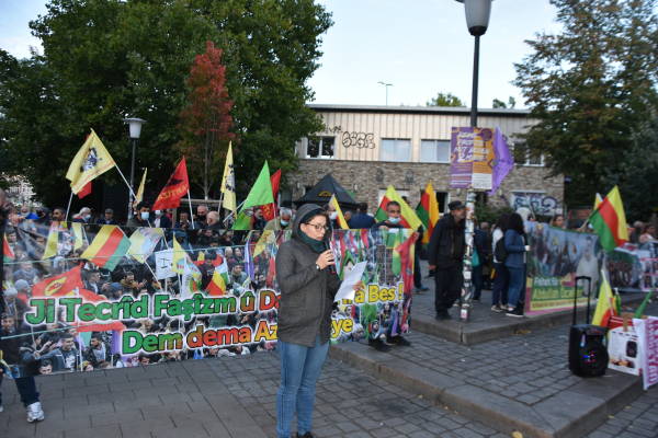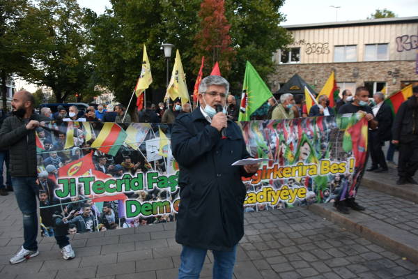 وألقى ممثل اتحاد القوى الديمقراطية، سرحد جتينكايا، كلمة في الفعالية التي شارك فيها العشرات من الكردستانيين وأصدقائهم الألمان، قال فيها إنه يتوجب على الجميع الوقوف إلى جانب حزب الشعوب الديمقراطية (HDP) ضد سياسات الإبادة التي تمارسها دولة الاحتلال التركي.