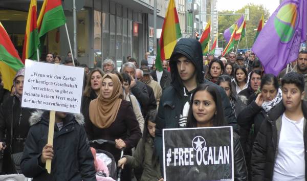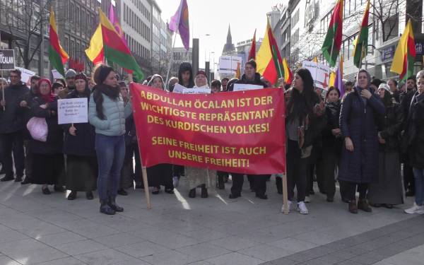 اجتمع العديد من الكردستانيون في ساحة Alte Synagoge واستنكروا العزلة المفروضة على القائد أوجلان.