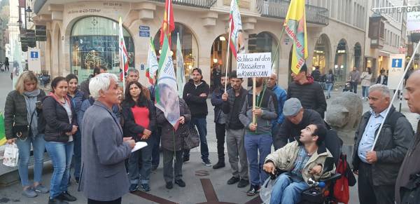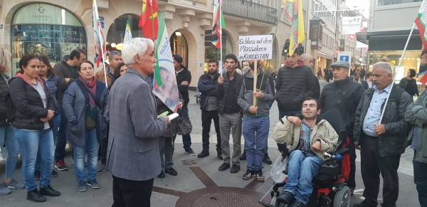 تجمّع الحشد في ساحة (Berenplatz)، حيث رفعوا رايات حزب العمال الكردستاني (PKK) ووحدات حماية الشعب (YPG) ووحدات حماية المرأة (YPJ) وصور أوجلان، ورددوا شعارات تندد بإرهاب الدولة الذي يمارسه الاحتلال التركي على الشعب الكردي وطغيان أردوغان وإجرامه.