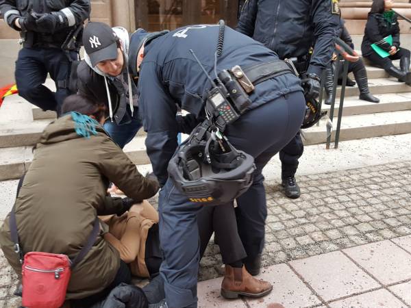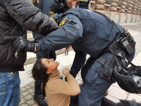 وهاجمت الشرطة السويدية الحشد الذي كان يردد شعار "أردوغان قاتل" ويتوجه نحو البرلمان السويدي. وبعد إشكال لم يدم طويلاً، قامت مجموعة من النساء باجتياز حاجز الشرطة والوصول إلى أمام مبنى البرلمان السويدي، لكن النساء اللواتي وصلن إلى أمام البرلمان تعرضن لهجوم عنيف من قبل الشرطة السويدية.