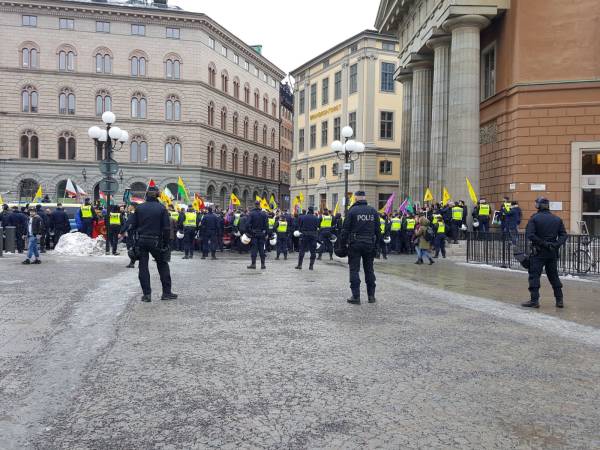 تجمّع مئات الأشخاص في تمام الساعة الثانية من بعد ظهر اليوم، أمام مبنى وزارة الخارجية السويدية في ستوكهولم، تنديداً بعدوان الاحتلال التركي على مقاطعة عفرين.