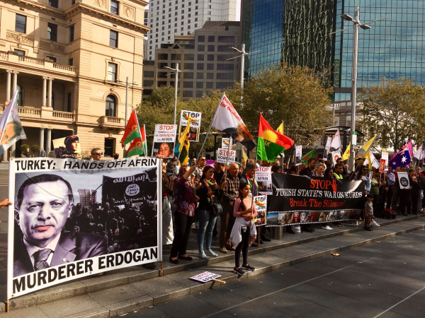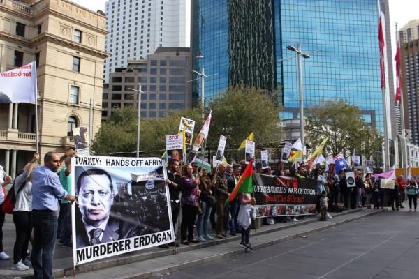 نظَم الكردستانيون وأصدقائهم من مناصري قضية الشعب الكردي وقفة في مدينة سيدني بأستراليا للتنديد بالاحتلال التركي لعفرين وسياسات الإبادة التي ينتهجها ضد أهالي عفرين.