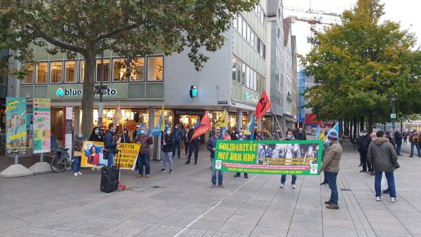 واعتصم المتظاهرون في ساحة "مونستر بلاتس" وسط المدينة، رافعين رايات حزب الشعوب الديمقراطي ولافتات مكتوب عليها عبارات باللغة الألمانيّة تندّد بالجرائم التي ترتكبها الدولة التركيّة.