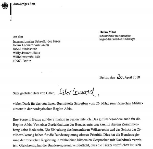 رد وزير الخارجية الألمانية «هايكو ماس» على رسالة موجهة إليه من قبل مجموعة من المؤسسات و المنظمات حول عفرين.
