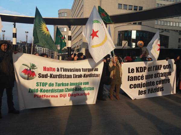 نظّم اتحاد المرأة الكردية في أوربا (YJK-E)ومركز المجتمع الكردي الديمقراطي في بلجيكا (NAV-BEL)مظاهرة في العاصمة البلجيكية بروكسل للتنديد بهجمات جيش الاحتلال التركي على مخمور وشنكال. وردد المشاركون شعارات تنعت أردوغان بالقاتل والفاشي. كما رفع المشاركون صور القائد عبدالله أوجلان ورايات حزب الاتحاد الديمقراطي (PYD).