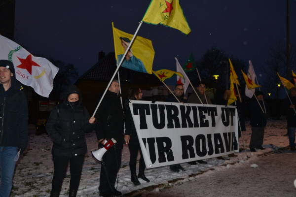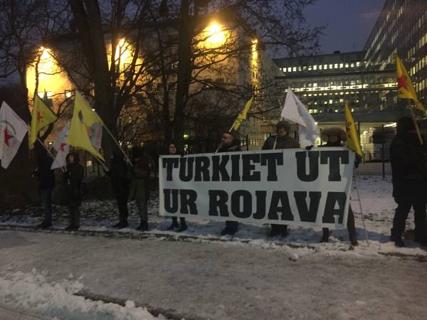 شهدت العاصمة السويدية ستوكهولم وقفة احتجاجية في تمام الثالثة عصراً من اليوم الخميس للتنديد بتهديدات جيش الاحتلال التركي والقرار الأمريكي القاضي بالانسحاب من سوريا، حيث حمل المشاركون لافتة كُتب عليها "فليخرج الاحتلال التركي من روجآفا" بالإضافة إلى حمل رايات حزب الاتحاد الديمقراطي (PYD) ورايات وحدات حماية الشعب (YPG) ووحدات حماية المرأة (YPJ) وصور القائد أوجلان.