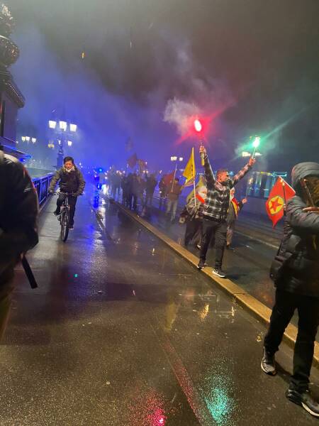 اجتمعت الشبيبة مساءاً في ساحة ترافالغار في لندن ورفعوا أعلام حزب العمال الكردستاني وحركة الشبيبة الثورية.