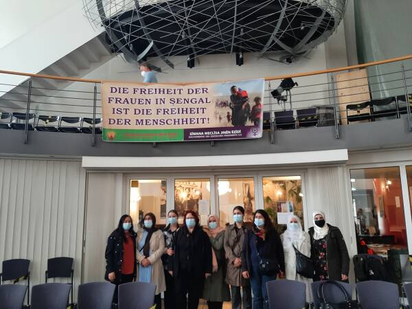 وباسم حركة جنولوجي ( علم المرأة) ، ألقت الممثلة ميشثيلد إكسو كلمة قالت فيها إن الأيزيديين يناضلون رغم كل شيء ويريدون العيش في شنكال بمحض إرادتهم.