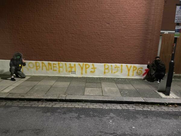 وكتبت الشبيبة، عبارات التالية؛ " 01. 11 كوباني"، " روج أفا (غرب كردستان)"، " وحدات حماية الشعب (YPG)"، " وحدات حماية المرأة (YPJ)"، على جدران الجامعة والمباني العامة والأماكن المزدحمة بالمرور في المدينة.