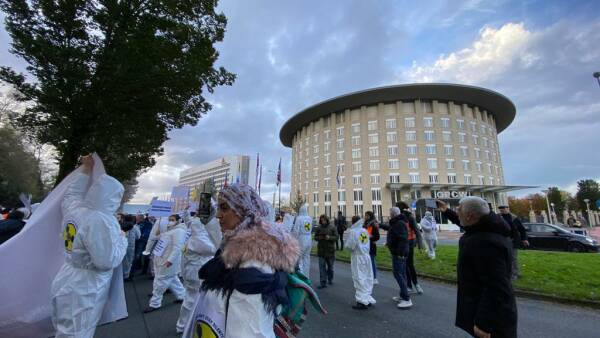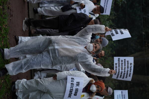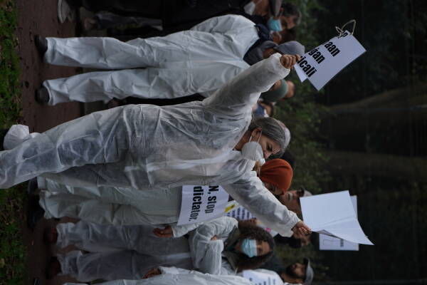 واحتج نشطاء يرتدون أقنعة وأزياء بيضاء على الأسلحة الكيماوية وحملوا لافتات منددة بالصمت منظمة حظر الأسلحة الكيميائية.