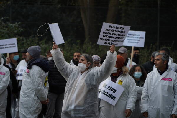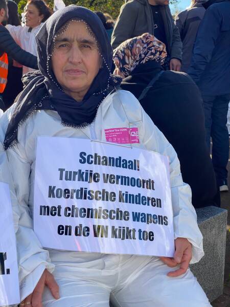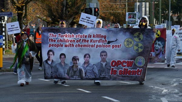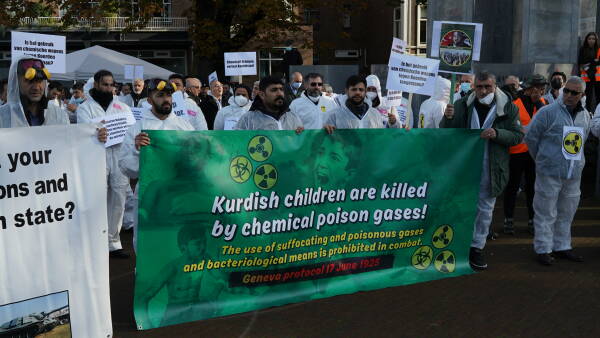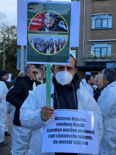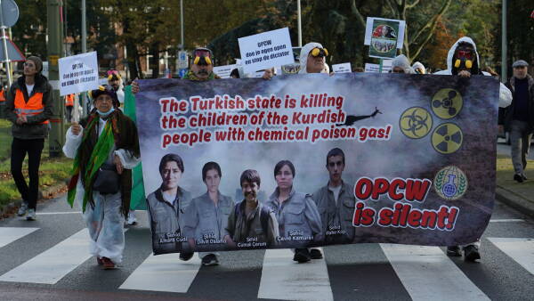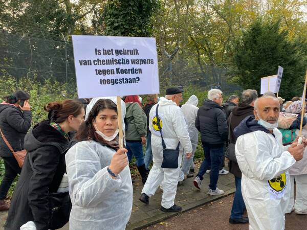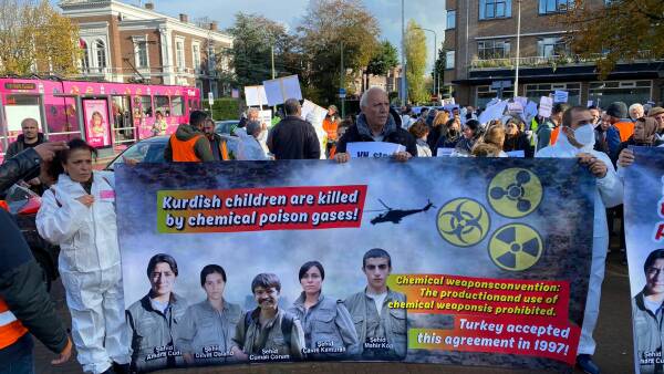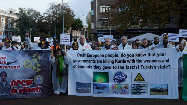 نظم الكردستانيون وأصدقاؤهم احتجاجاً في هولندا أمام مبنى منظمة حظر الأسلحة الكيماوية (OPCW)، تنديداً باستخدام الاحتلال التركي للأسلحة الكيماوية والصمت المجتمع الدولي حيالها.